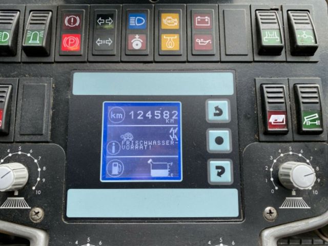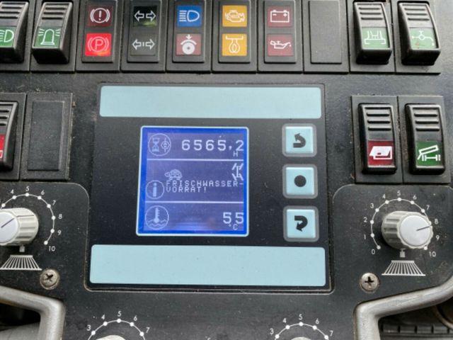 Kehrmaschine, Baujahr 2010, Stunden 6865, DMC 4900 kg, Motorleistung 100 PS (74 kW), Abmessungen Länge x Breite x Höhe: 4.860 x 1.300 x 1.995 mm, Wassertankinhalt 330 Liter, maximale Kehrbreite 2500 mm.